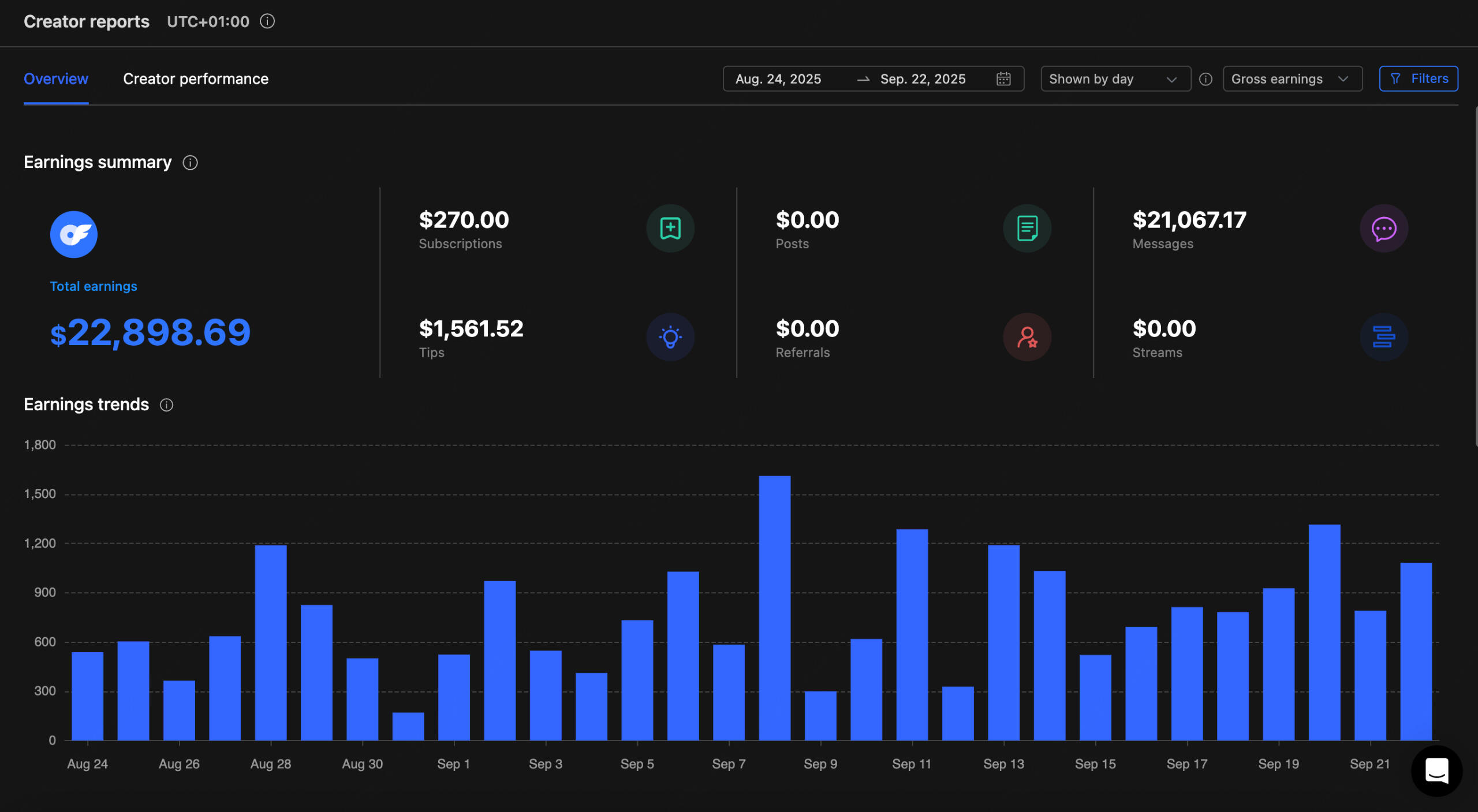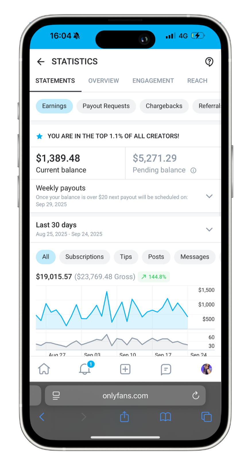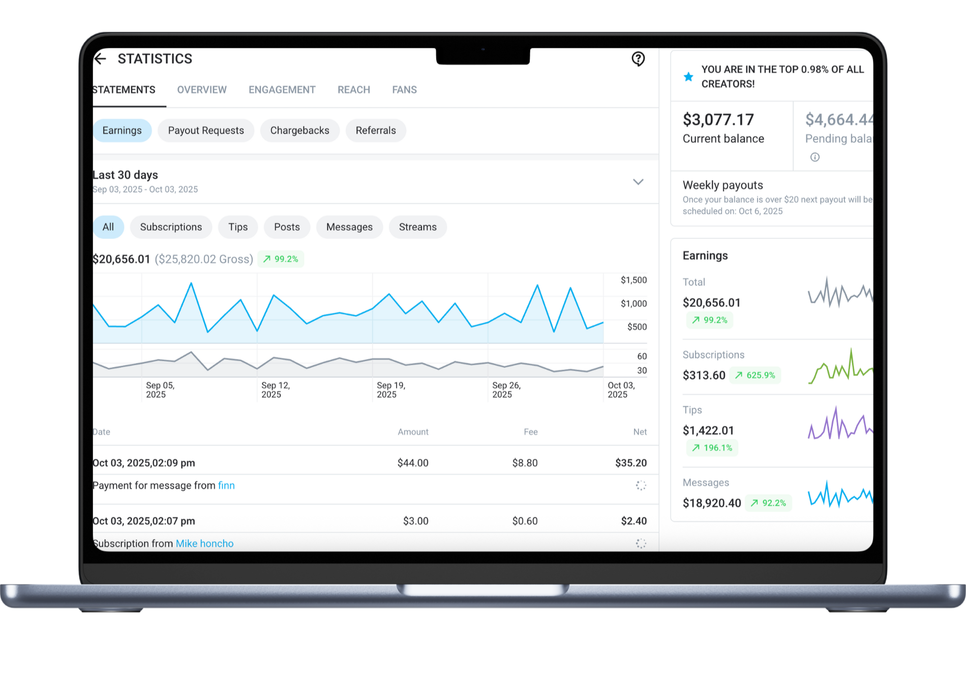 Creators who are already active usually see noticeable growth within two to three weeks. New creators can often start earning in their first month, commonly between $1,000 and $7,000. With regular content and our continued support, both audience and revenue increase steadily, with many creators hitting approximately $20,000 per month by their third month.